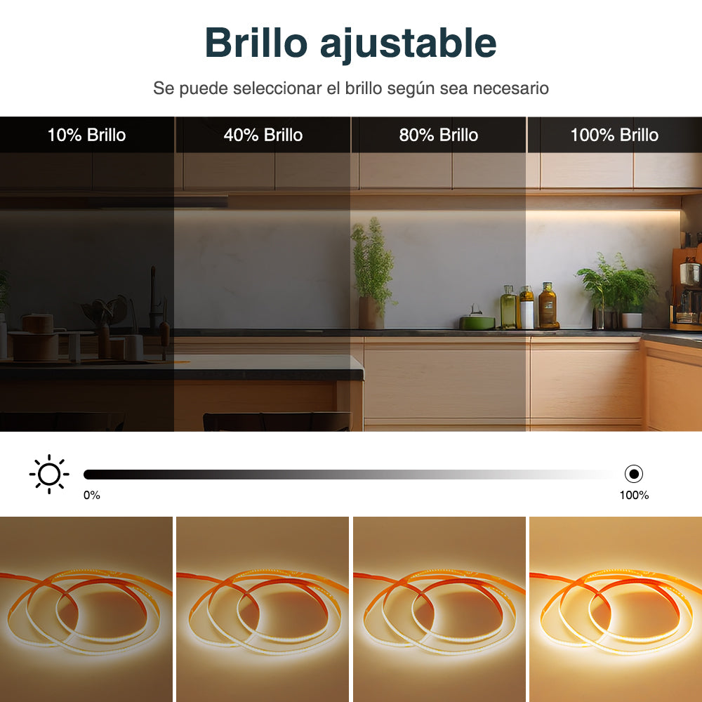 La tira cuenta con 2800 leds tipo COB en sus 5mts de longitud (280 LED/m), que hacen que las unidades LED estén más cercanas y la iluminación se distribuya de manera uniforme con gran intensidad. Su extensión le permite cubrir espacios grandes para decoración.